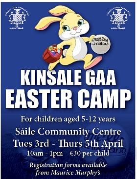 Reminder to register for the Club Easter Camp, €30 for 3 days, 10-1pm. For boys and girls 5 years (if in Junior Infants) to 12 years! Forms available in Maurice Murphy’s and places are filling up fast!